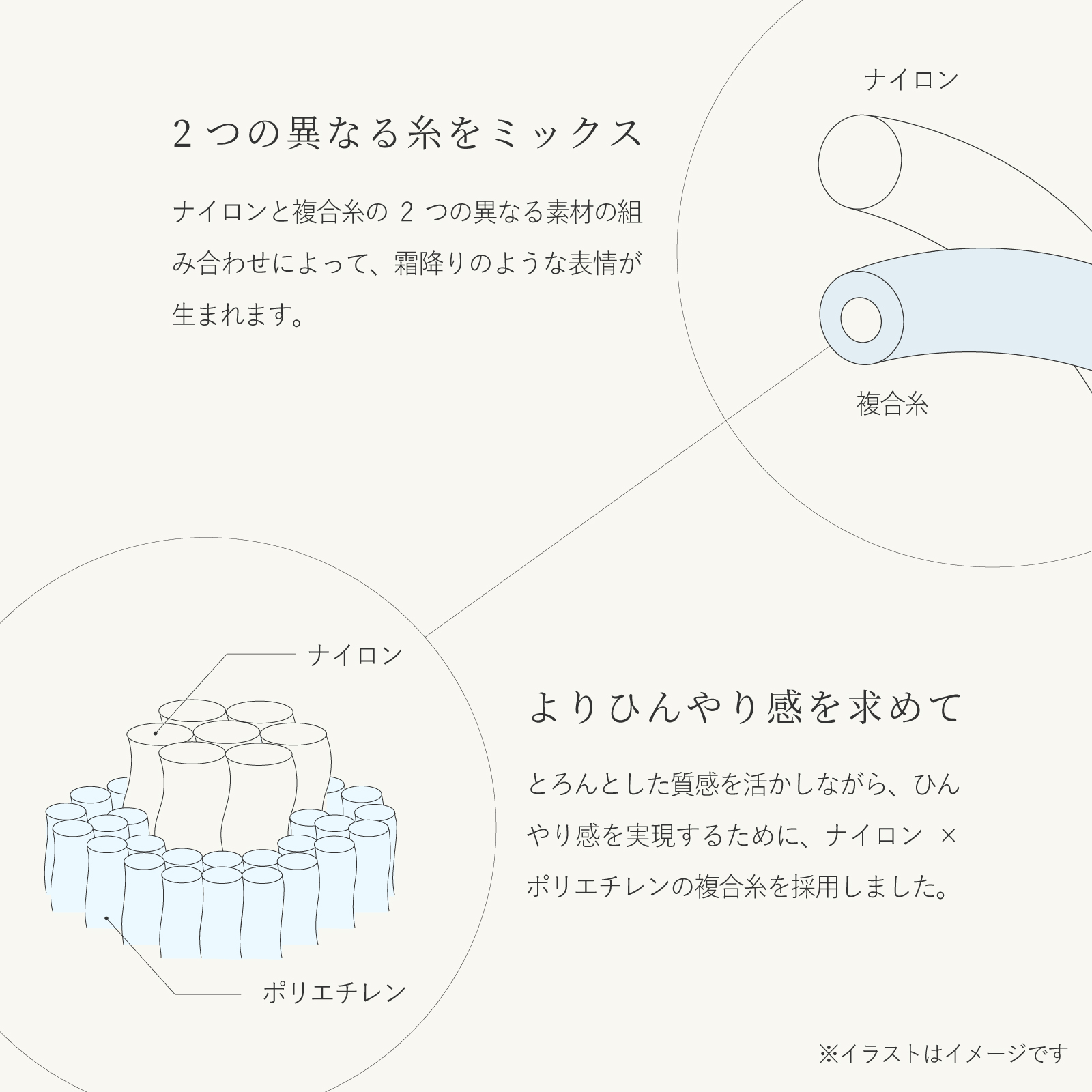 | 素材 | (表生地)複合繊維(ナイロン/ポリエチレン)60%、ナイロン40%(詰めもの)ポリエステル100%(裏生地)ナイロン100% |