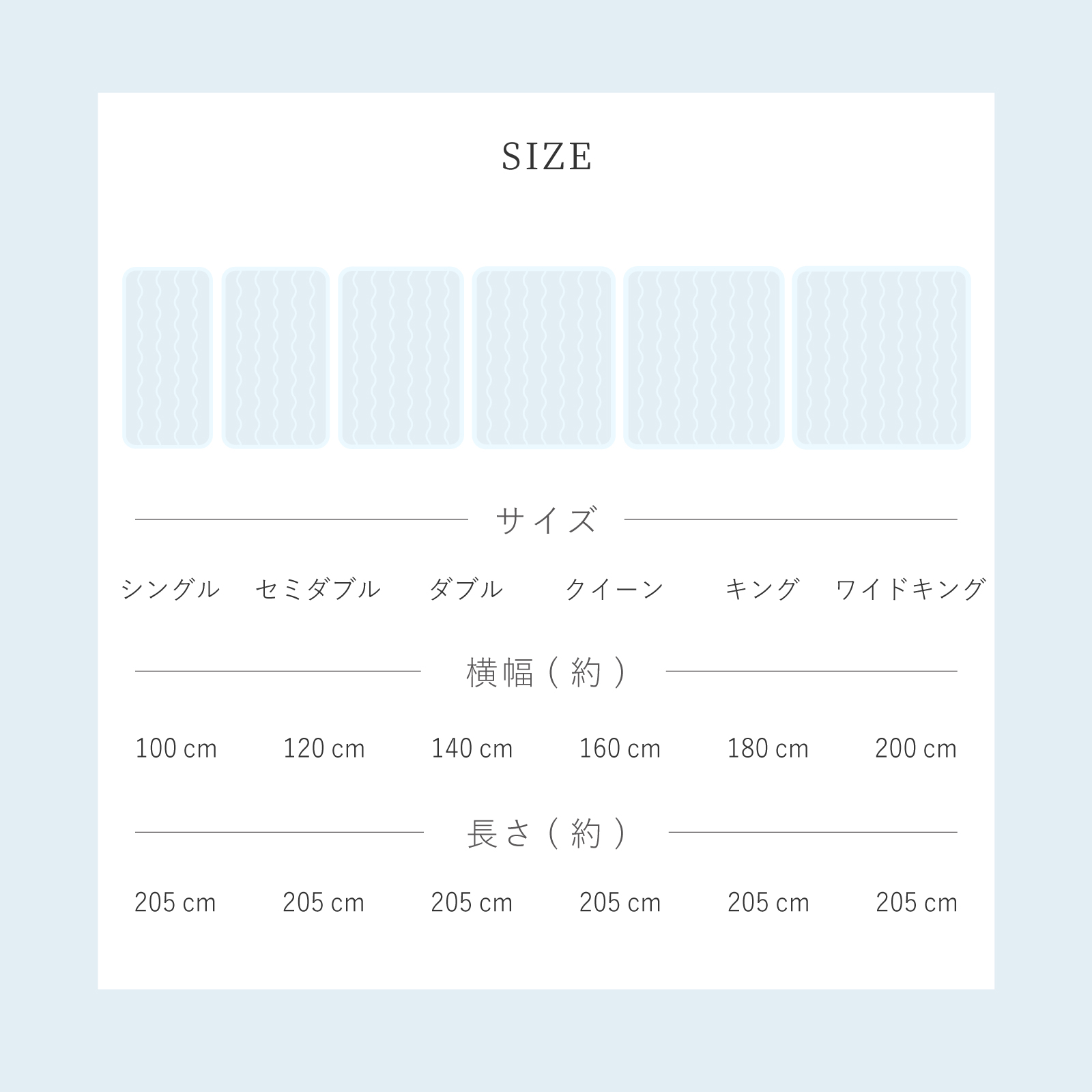 | サイズ | シングル:約100cm×205cm セミダブル:約120cm×205cm ダブル:約140cm×205cm クイーン:約160cm×205cm キング:約180cm×205cm ワイドキング:約200cm×205cm |